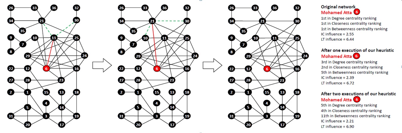 Graf pokazuje, co mógłby zrobić Mohamed Atta (#6), aby ukryć swoje centralne znaczenie w grupie. Na rys. 1 #6 ucina połączenie z #11. Natomiast doprowadza do poznania #11 przez #21 i #30. Na rys. 2 #6 ucina kontakt z #21, ale za to łączy #21 z #10 i #30. W rezultacie - rys. 3 - znaczenie #6 dla algorytmów analizujących relacje (miar centralności) zdecydowanie spada. https://arxiv.org/abs/1608.00375v1